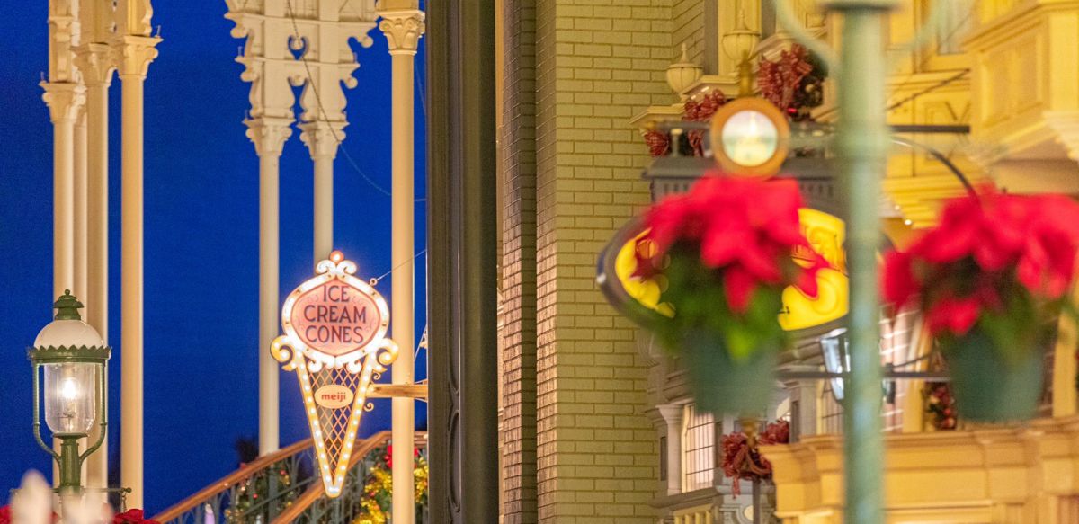東京ディズニーランドもワールドバザールのクリスマスツリーはなく、プラザ周辺にバナーなどが飾られたり、植栽が一部、クリスマスデザインになっているといった感じ。
