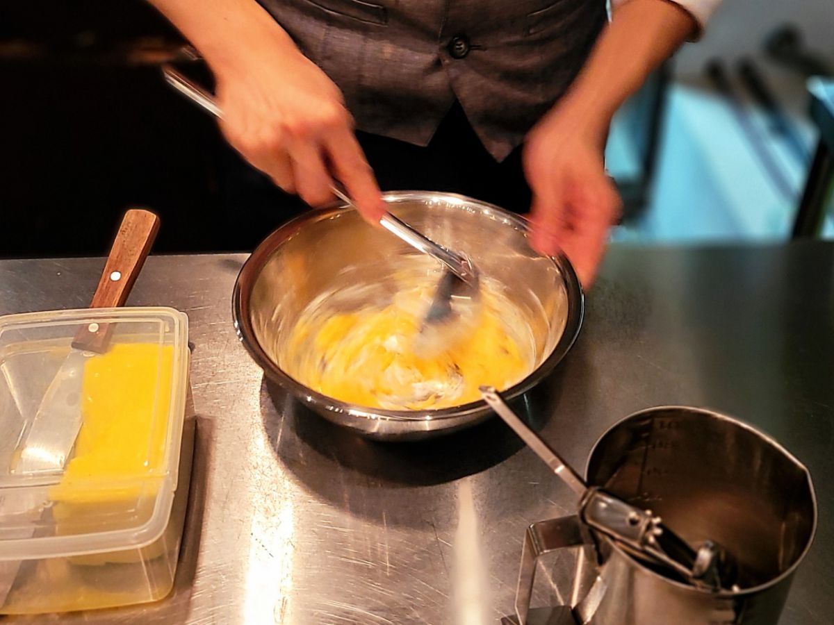 まずオーダーを受けてから、粉とこだわりの「那須御養卵」の赤玉をシャカシャカと混ぜます。