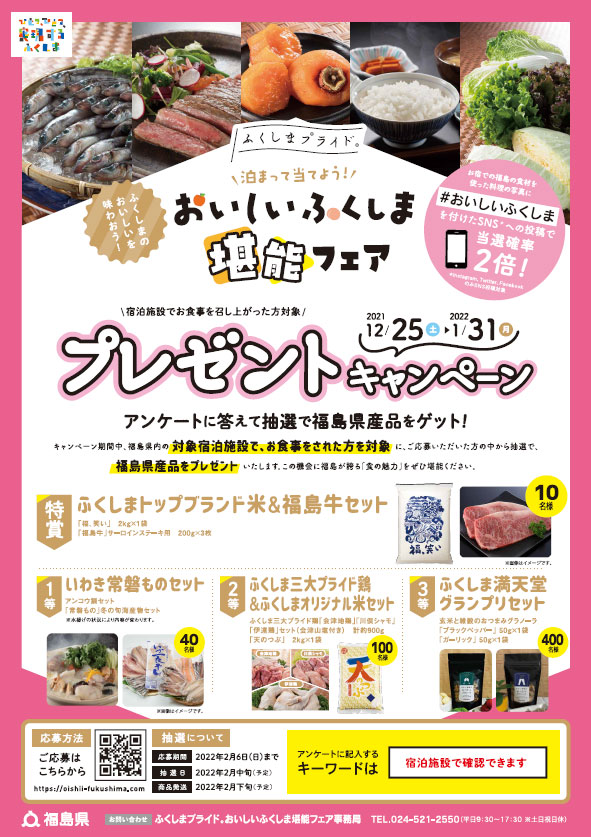 プレゼントキャンペーンへの参加の仕方はとっても簡単!対象宿泊施設で飲食しフェアの公式サイトにアクセス、フェアに関するアンケートに答えるだけ。さらに、Instagram、TwitterやFacebookで「♯おいしいふくしま」と投稿するとキャンペーン当選確率がなんと2倍に!ぜひチャレンジしてください!