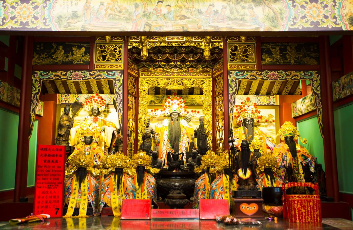 廟内に戻り、祭壇中央に祀られた城隍爺を参拝。城隍爺は無事息災、金運上昇にご利益があるので、具体的に願いを伝えましょう。礼拝をするときは、その都度自己紹介と、願い事を伝えた後に3回お辞儀するのをお忘れなく。