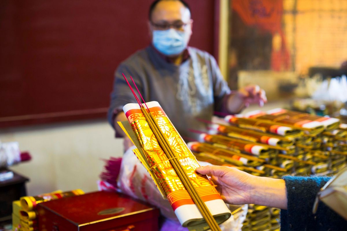 まずは入口付近の売店で、線香と金紙を買います。初めて参拝に訪れた人は、本殿内の別の売店でお供えセットも購入しましょう。