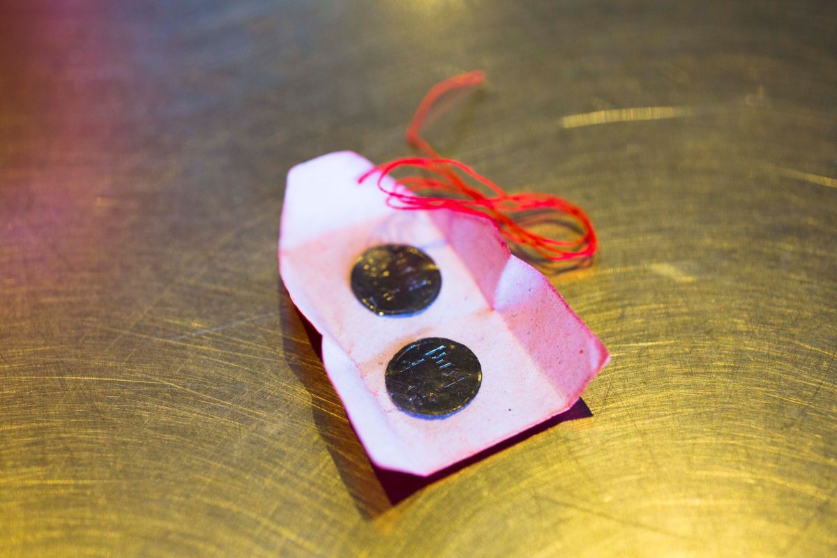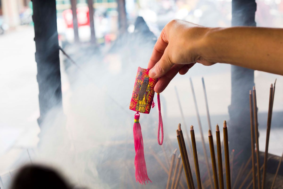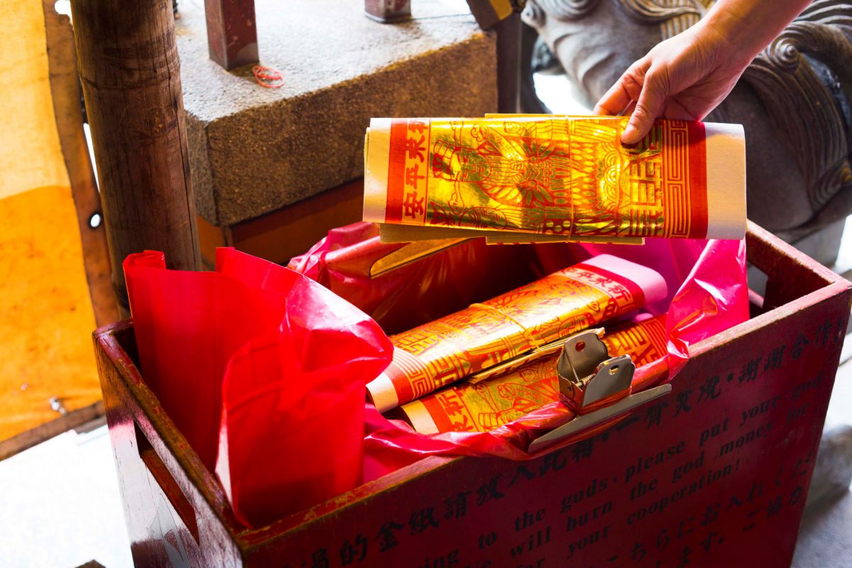 初めて参拝に訪れた人が購入するお供えセットの中には、お守りが入っています。中に封入されているのは鉛銭(鉛の小銭)と紅絲線(赤い糸)。天公爐に線香を立てた後、お守りは爐の上を3回時計回りに回しましょう。