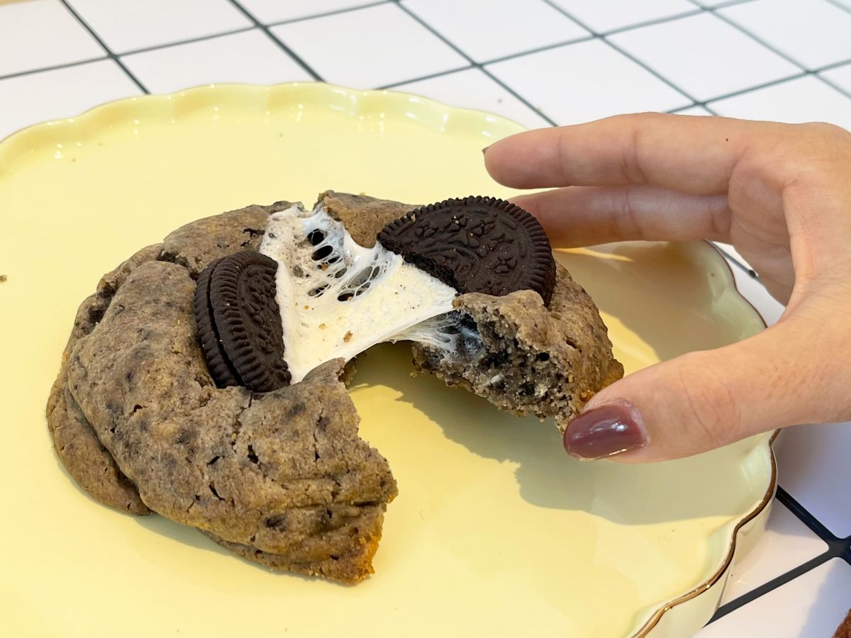 割ってみると、溶けたマシュマロがびよーーんと伸びて食べる楽しさもアップ♪オレオの深いココア感とスモアの甘さ、そしてしっとりとしたクッキー生地とオレオのサクサクとした食感が混ざり合っておいしい…!罪悪感もあるけど、それがいいんです。