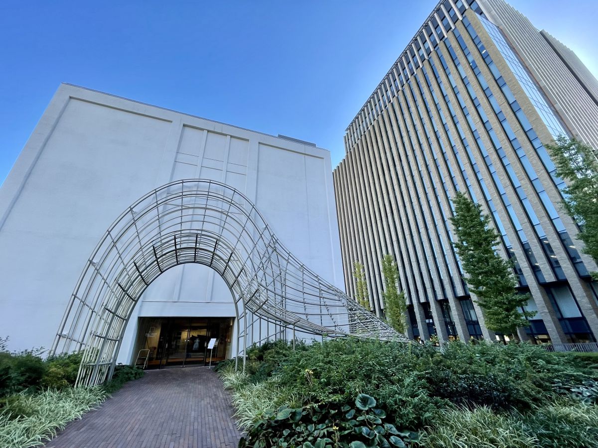 東京メトロ・早稲田駅から徒歩7分の早稲田大学構内にある「村上春樹ライブラリー」こと「国際文学館」。既存の校舎を改修したという真っ白な建物には、まるで時空の歪みを表すかのようにダイナミックにうねるようなトンネルとひさしが。