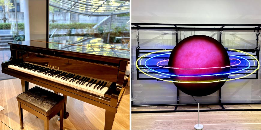 「村上さんの書斎」や「橙子猫」を含む地下1階のフロアは、実は予約なしでも入れるエリア!「ピーター・キャット」で生演奏に使われていたというピアノや、「海辺のカフカ」の舞台で使用されていた装置なども展示されていて、みどころたっぷり♪