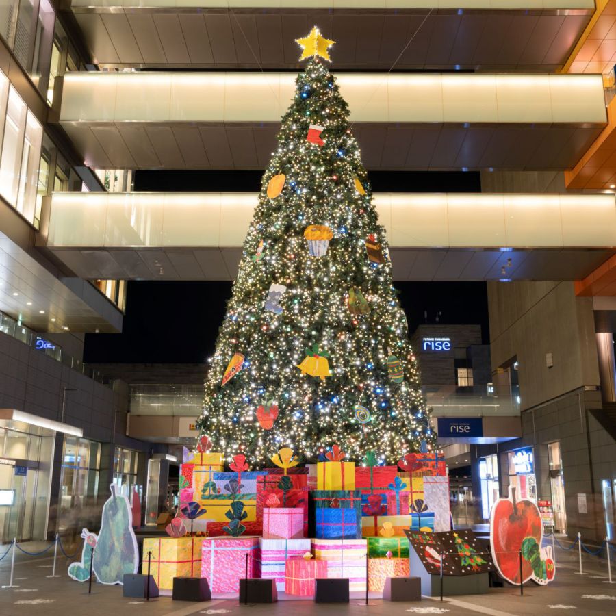 二子玉川ライズの吹き抜け空間となっているガレリアでは、絵本『はらぺこあおむし』の世界観を表現した高さ約13mの巨大なクリスマスツリー「はらぺこあおむしとクリスマスツリー」が点灯。ツリーには、はらぺこあおむしの食べた跡があるカラフルな食べ物のオーナメントが飾られています。ツリーの正面にはエリック・カールのテクスチャを使用したカラフルなプレゼントボックスや絵本のオブジェが設置され、どこかに隠れた小さなはらぺこあおむしを探し出すお楽しみも。