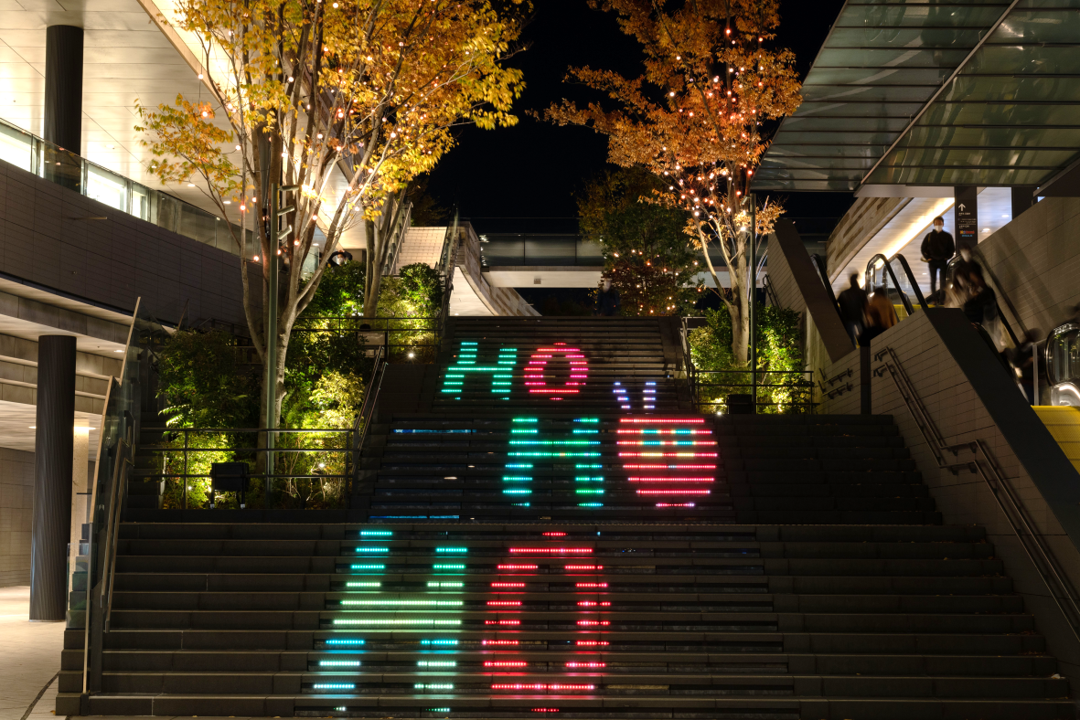 ウィンターイルミネーション「ふしぎな森のやさしい光」はクリスマス以降も3月末まで続きます。大階段のイルミネーションは、バレンタインなど季節に応じてデザインを変えた演出を予定しています。