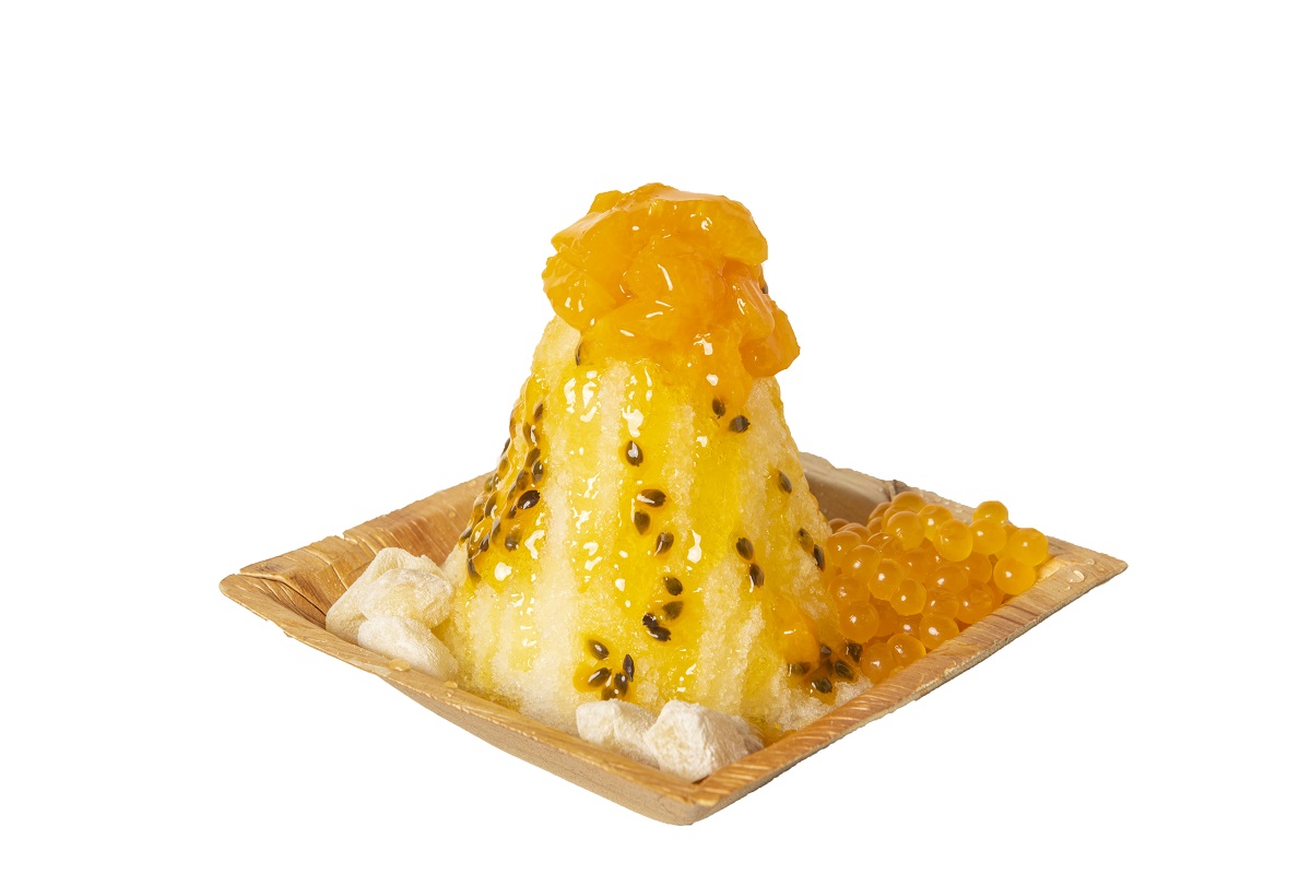 「ヘブンリーリリコイ」$10.95。パッションフルーツシロップにリリコイ・ポッピング・ボバ(タピオカ)、もちをトッピング!シェイブアイスの中にはフローズンヨーグルトが入って、さっぱりとしたおいしさです。