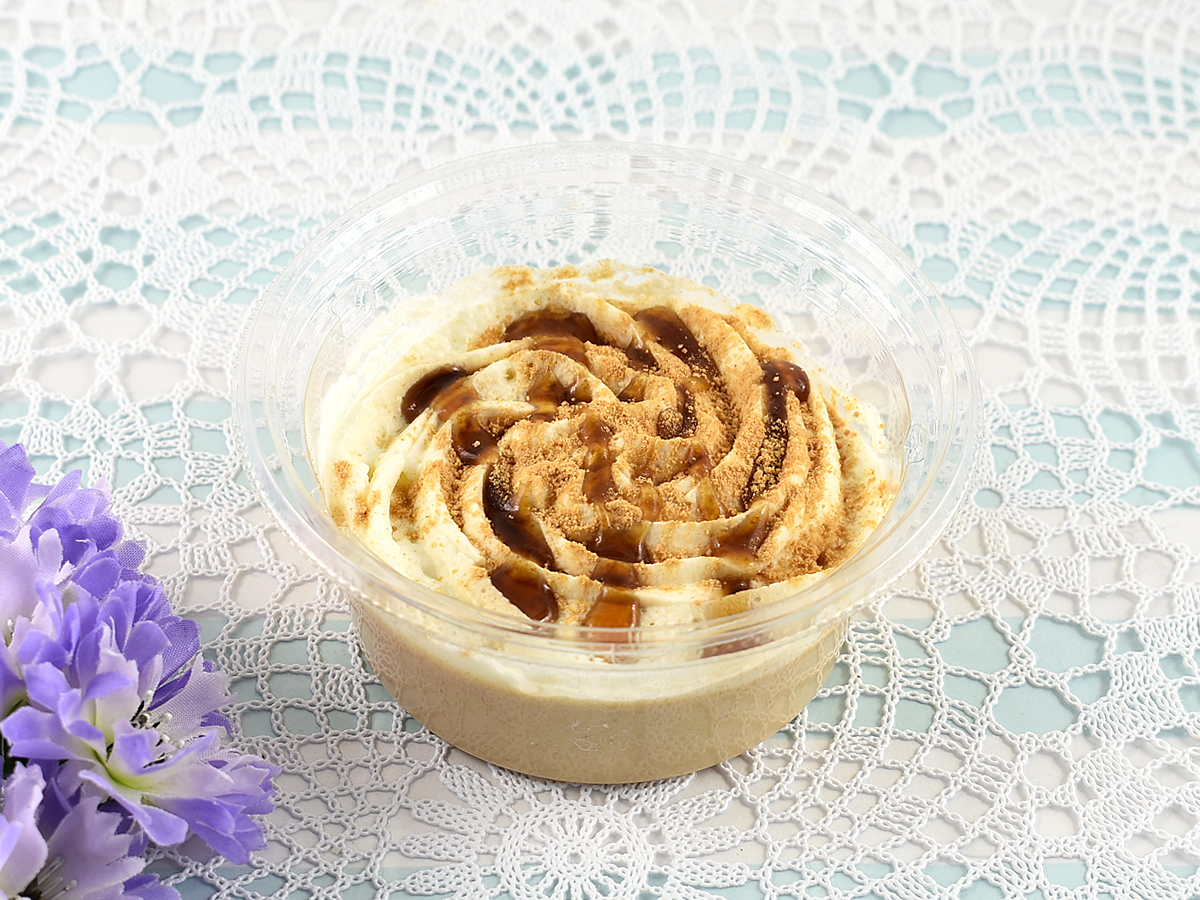 きなこをたっぷり使用したババロアの上に、ホイップクリームと黒蜜ソースがトッピング。パッと見では、プリンやゼリーのようにも見えるカップスイーツです。和スイーツらしく“ばばろあ”とひらがなで表記されているのもカワイイですよね。