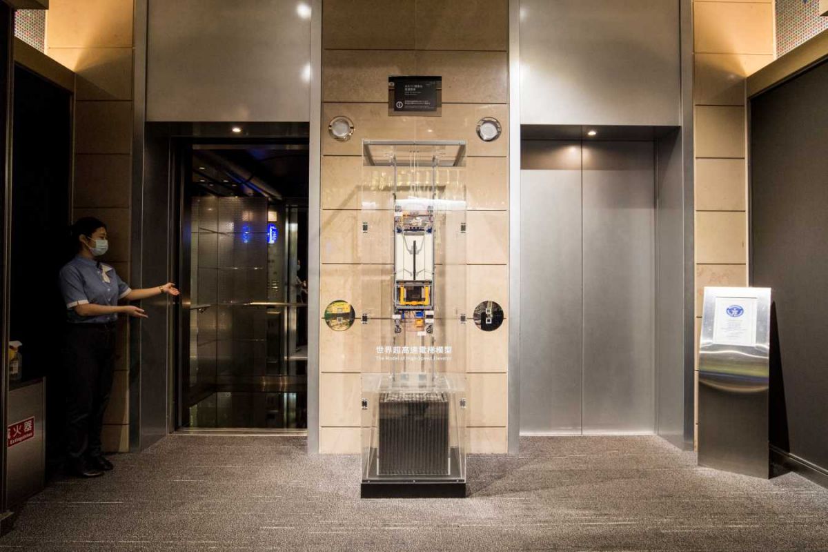 いよいよエレベーターで上階へと向かいます。一般チケットで展望台へ行く場合、ここでも列に並ぶ必要がありますが、「Skyline460」体験者は「快速通行」利用で待ち時間なし!毎分1010メートルの早さであっという間に89階展望台へと上っていきます。