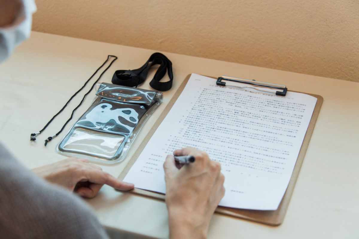 同意書(日本語あり)にサインをしたら身支度を整えます。持ち込めるのはスマートフォンのみ。貸し出される専用ケースに入れて首から下げましょう。メガネの人はストラップの貸出も。荷物は無料ロッカーへ入れてください。最後に安全装備を装着します。
