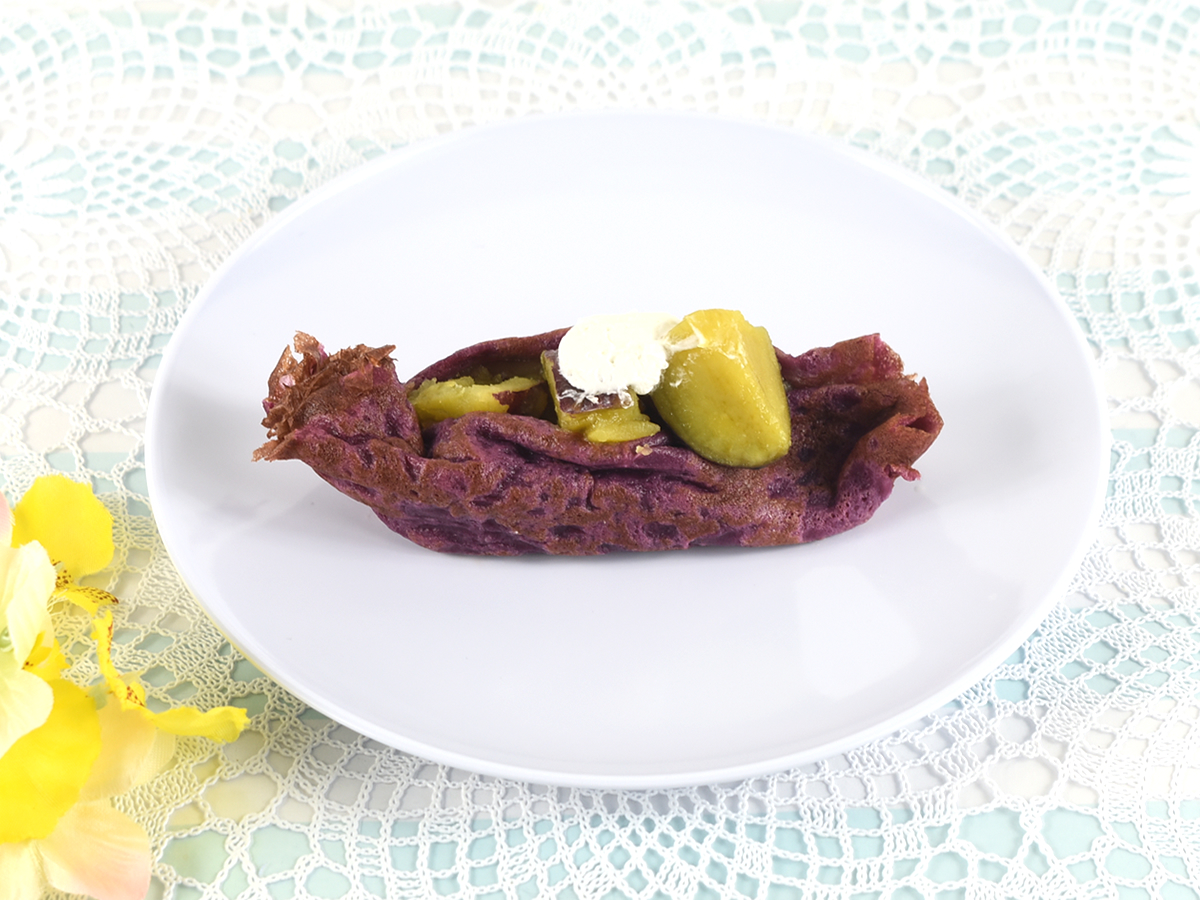 紅あずまの焼き芋と皮つきの焼き芋を混ぜて作られたペーストは超濃厚。さつまいもならではのもったりとした甘みがたまりません! 皮つきの焼き芋が入っているためか、さつまいもの深い風味も感じられるのがGOOD。なめらかな舌触りのペーストとモチモチしたクレープ生地の相性もバツグンです。