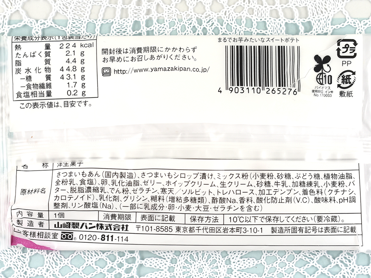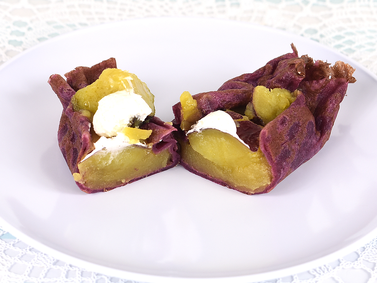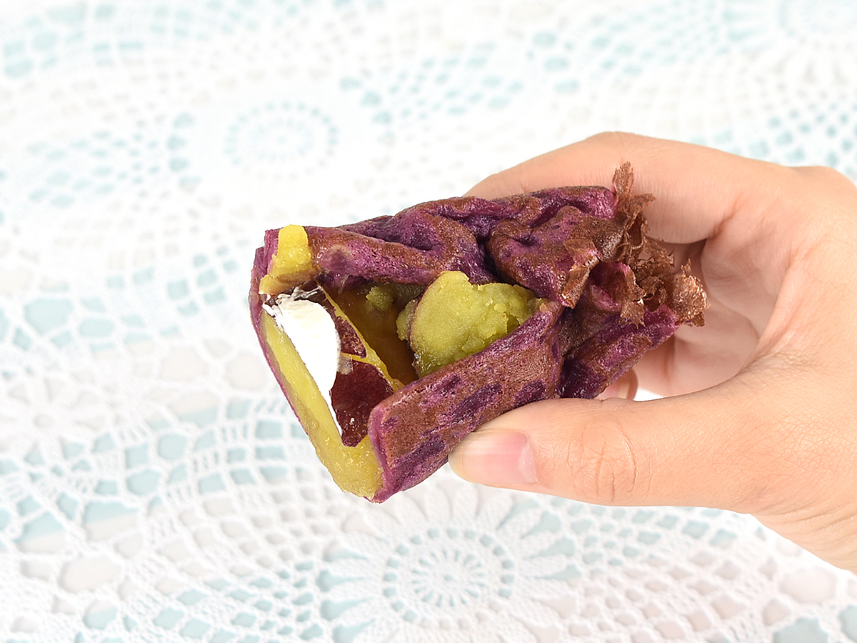 「スイートポテトなんだから“お芋みたい”なのは当然では?」と思っていたのですが、パッケージを開けてみて納得。スイートポテト自体がまるで小さなさつまいもに見えます。さつまいも風味のクレープ生地で包まれているのは、焼き芋のペーストと乱切りの紅あずま。深い黄色に焼き目がついた一般的なスイートポテトのイメージをガラッと覆す見た目で、食べる前から楽しめますね。