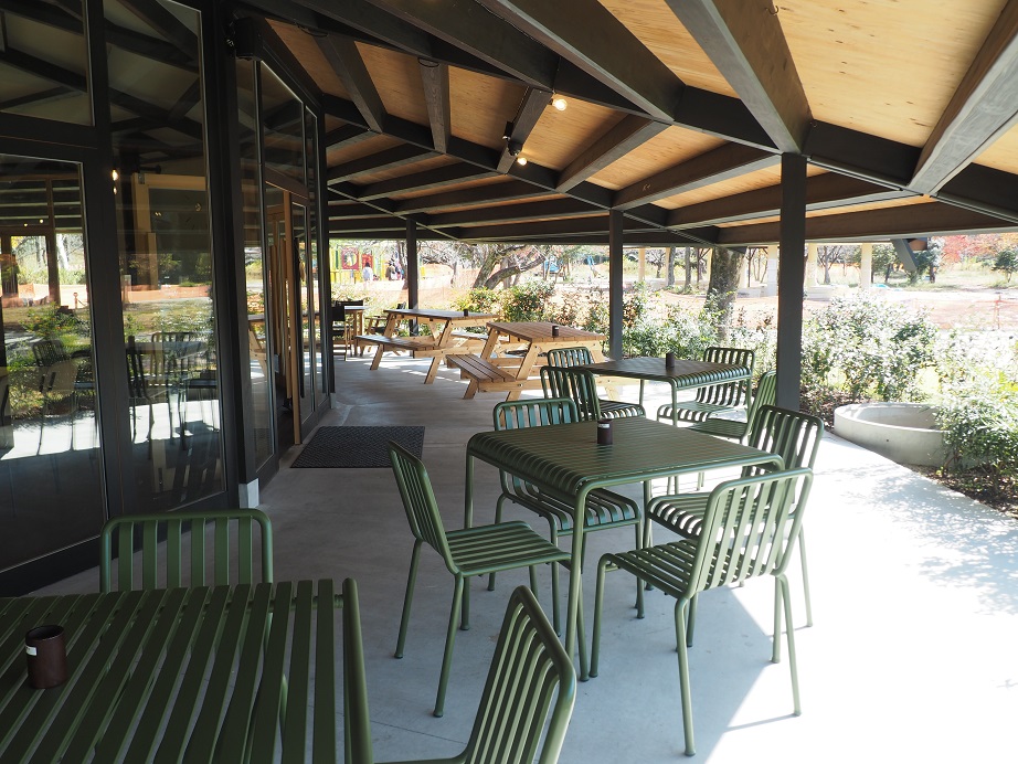 屋根のあるテラス席もあり、ペットと一緒に過ごすこともできます。緑豊かな公園に充満する爽やかな空気を感じながらの食事は、とても清々しいものです。