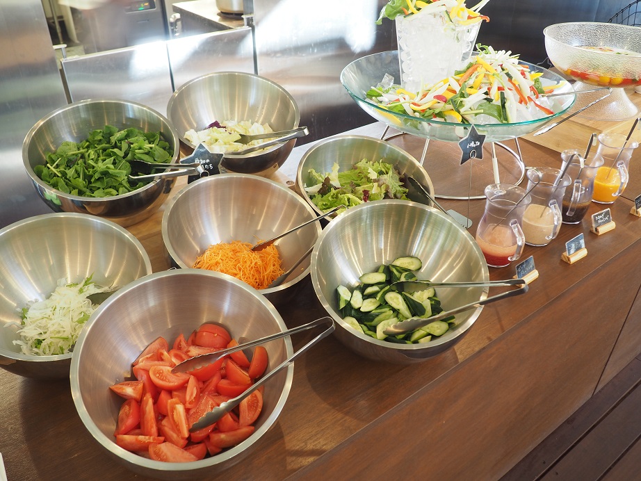 店内には守山区や瀬戸、日進、安城など近隣でとれた野菜を中心に使用した料理が多く並んでいます。エントランス付近にはサラダ用の野菜が彩りよく盛り付けられており、一際目を引きます。ドレッシングも4種類ほどが並んでいますが、オリジナルで作っているにんじんドレッシングはとくにおすすめ。人参のやさしい甘さを感じられ、野菜のおいしさを引き立ててくれる逸品です。