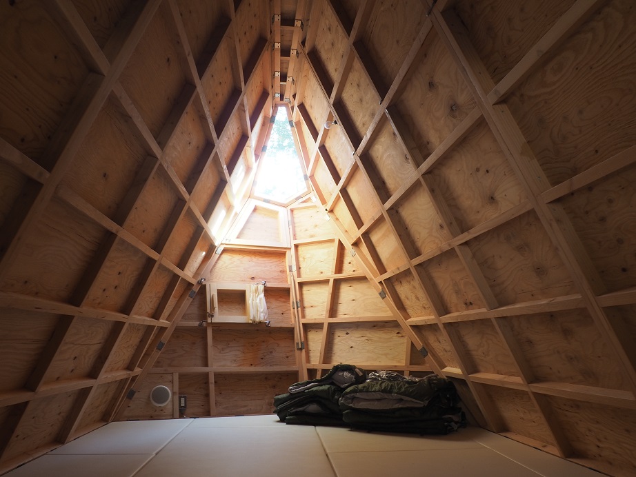 天窓から森の木々や空を眺めることができ、圧迫をほとんど感じません。冷暖房も完備されているため、夜も快適。床はふかふかのクッションになっており、人数分のシュラフも用意されています。