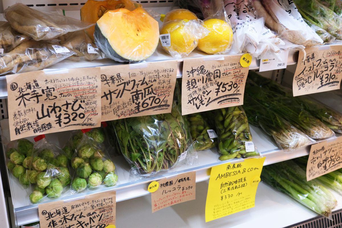 また、店内の奥には、週2回ほど全国各地から集められる新鮮な野菜も目白押し。手書きのPOPにそれぞれの野菜の魅力がぎっしり書き込まれているのも特徴。ときには入荷した野菜で作ったオリジナルジェラートを生産者に送っていることもあるそうで、密な関係性が伺えます。
