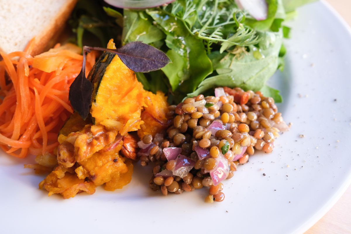 また、日替わりのお惣菜も絶品…!この日いただいたのは、「柿とにんじんのラペ」「かぼちゃのメープルナッツサラダ」「レンズ豆のサラダ」。