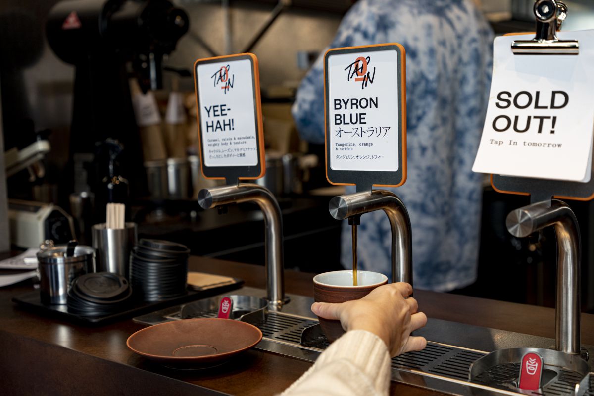 特に話題となっているのが、店先にある「Freepour Coffee on Tap(フリーポワ コーヒー オンタップ)」。まるでビールサーバーのような見た目の機械からコーヒーが注がれます!