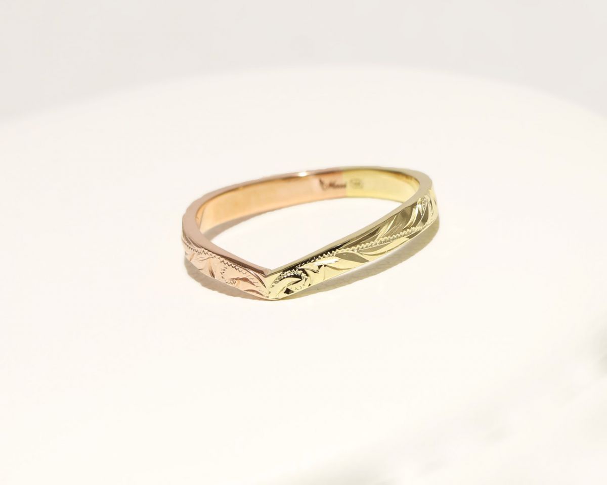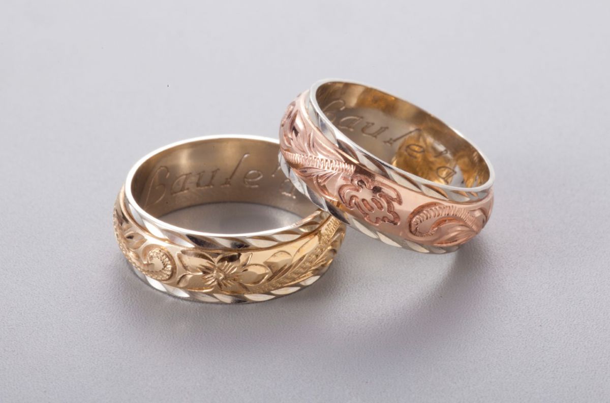 おすすめは「2色ゴールドのハワイアンリング」$1200~(サイズにより異なる) 。ハネムーンでハワイに来られるカップルに大人気の、ハワイアンジュエリーのペアリングです。リングにはスクロール(波)をベースにプルメリア(花)やホヌ(海亀)が彫られており、ハワイを感じさせるデザインになっています。オーダーメイドなので、自分のイニシャルを彫る事も可能!またリング裏面にはハワイ語や記念日を無料で刻印してもらえます。平日にオーダーをすれば翌日の夜9時には仕上がっているので、滞在中にオリジナルのハワイアンリングを受け取ることができますよ!