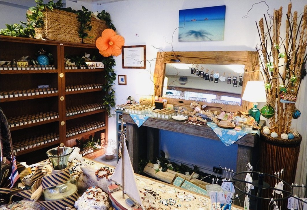 約680種類のパワーストーン・天然石をそろえる専門店。主にラニカイビーチの太陽の下で浄化した天然石が、ビンに入ってずらりと並び、一粒一粒手に取って触れることができます。店内では、オリジナルブレスレット作りを体験することもできます。