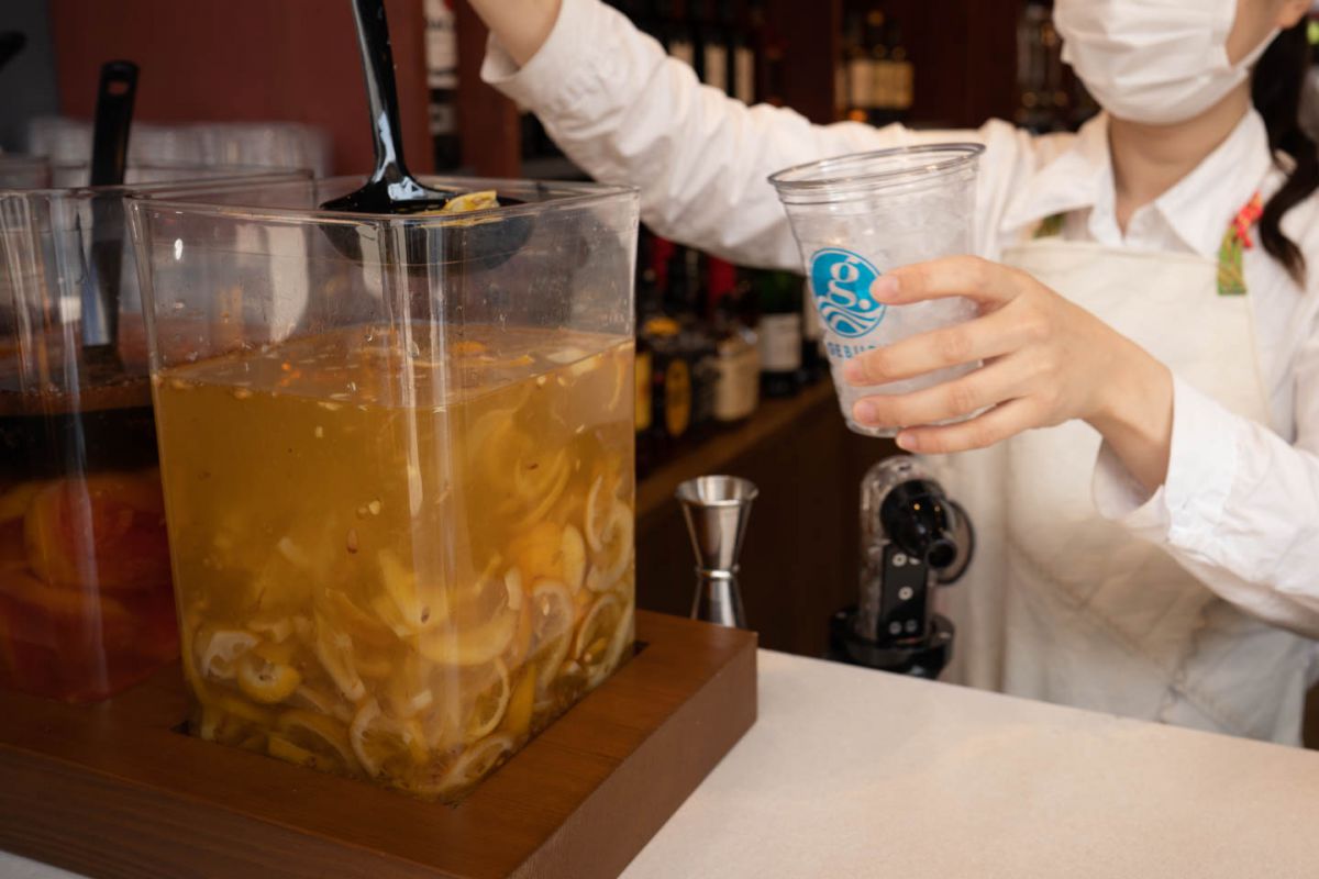 自家製シロップをソーダで割った広島レモンソーダは、広島レモンの甘酸っぱいうま味をしっかりと感じます。皮付き果肉がたっぷり入っているので、よく混ぜてドリンクとして広島レモンを味わったあとは、皮まで食べるのがおすすめ!