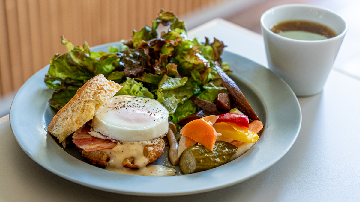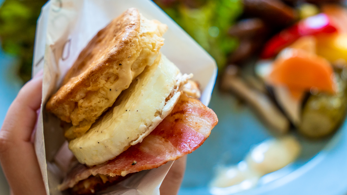 メイプルシロップ、レモン、牛乳などをブレンドした自家製バターミルクで小麦粉を練り込んで作るアメリカンビスケット。そのやさしい甘さは、塩気のある目玉焼きやベーコンとも相性抜群です。味の決め手は、コクが深くてさわやかさもある白味噌サワークリーム。サクふわな生地、柔らかなエッグ、カリカリのベーコンと幾層もの食感が楽しめるので、見た目以上に満足感たっぷりです。