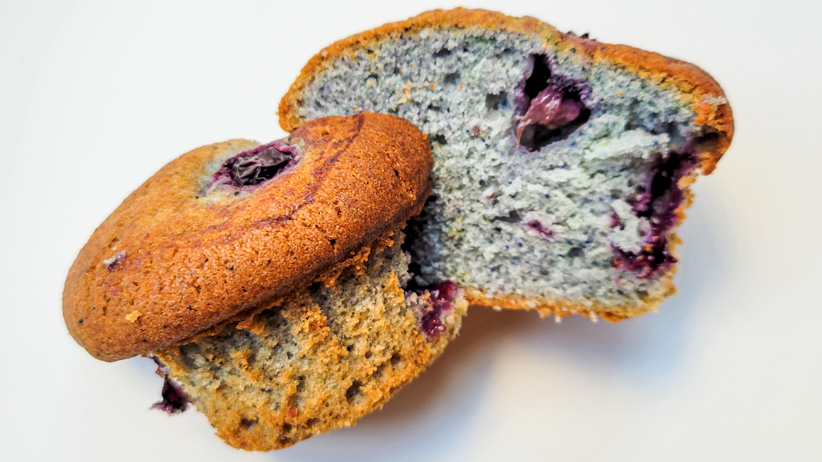 店頭には、南国らしい食材を使ったおいしそうなお菓子がずらり。なかでも気になったのは「バタフライピーとブルーベリーのマフィン」350円。割ってみると、中はフォトジェニックな青紫色。かわいらしいツブツブもあり、どこか南の国のフルーツを彷彿とさせます。もちろん着色料などの添加物は一切不使用。沖縄などに生息する青い花・バタフライピーを使用しつつ、ブルーベリーも加えた見た目にも楽しいマフィンです。