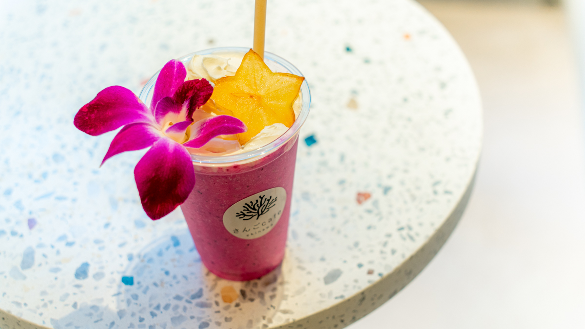 ドリンクと合わせるなら、「旬の沖縄フルーツを使用したスムージー」800円がぴったり。夏から冬にかけての定番は、沖縄の日差しを浴びて元気に育ったドラゴンフルーツです。ピンク色なのは、強力な抗酸化作用があることで知られ、美容や健康への効果も期待できるアントシアニンが豊富だから。かわいらしいだけじゃなく、プチプチとしたドラゴンフルーツらしい食感も楽しく、南国気分を最高に盛り上げてくれますよ。
