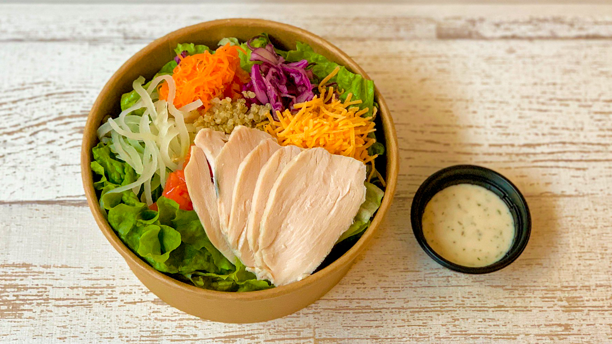 「サラダチキンボウル」800円は、キャロットラペ、沖縄産青パパイヤなどカラフルなお野菜にスーパーフード・キヌアを加え、自家製サラダチキンをのせたヘルシーメニュー。お弁当としてテイクアウトするにも最適です。