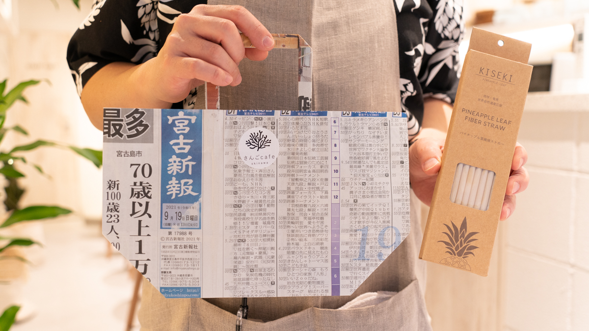 持ち帰り用のエコバッグは、宮古島の自立支援施設のみなさんが制作したもの。地元の新聞が再利用されていて、その記事やテレビ欄からも沖縄カルチャーを感じることができます。 ほかにも、先ほどのスムージーにも使用されていたストローはパイナップルの繊維を利用したエコ商品。10年後の環境を考えながらSDGsにも力を入れている店長さんは、陽気なだけじゃなく、とっても立派な方なんです。お店のコンセプトは「癒やしの空間」と言っていましたが、なによりお客さんを癒やすのは、店長さんの魅力的な人柄なのかもしれません。