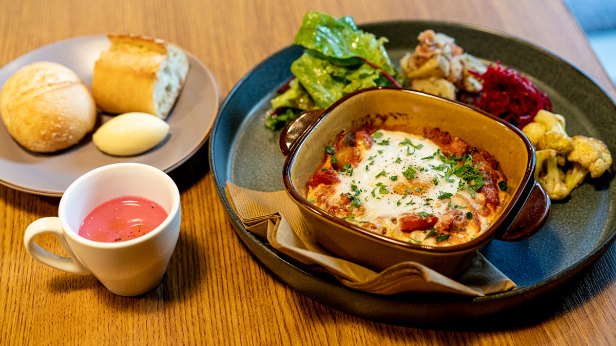 オープンから14時までのランチタイムであれば、メインディッシュが選べる「Lunch Set」1400円が断然おすすめ。今回は「ハンバーグの赤ワインソース」と人気を二分しているという、イスラエルの定番卵料理「シャクシュカ」をメインディッシュに選びました。