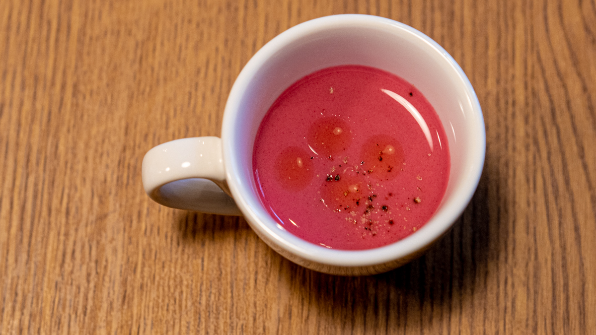 本日のスープは北海道産のビーツを使用したポタージュ。じっくりとローストしたビーツならではの甘さが、じんわりと体に染み渡ります。