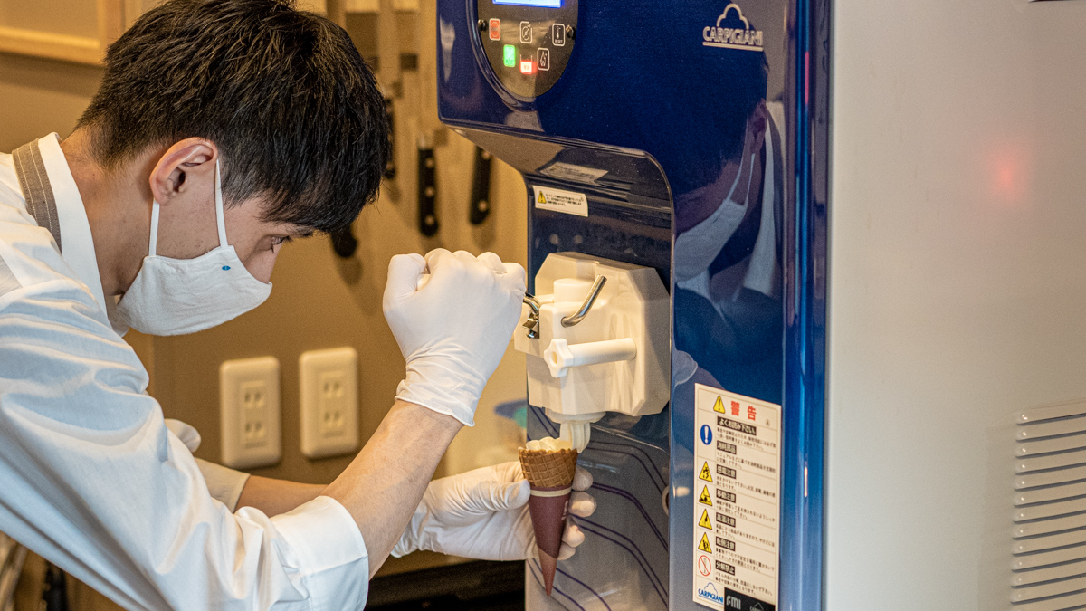 お店に入ったときから興味津々だったのが、スタイリッシュなソフトクリームマシン。こちらはイタリアのカルピジャーニ社による最高級の機械です。人よんでソフトクリーム界のフェラーリ。もちろん車ではないのでスピードが早いわけではありません。一般的なものよりも細かな空気をたっぷりと含ませることができるので、舌触りなめらかな極上のソフトクリームに仕上がるそうなんです。