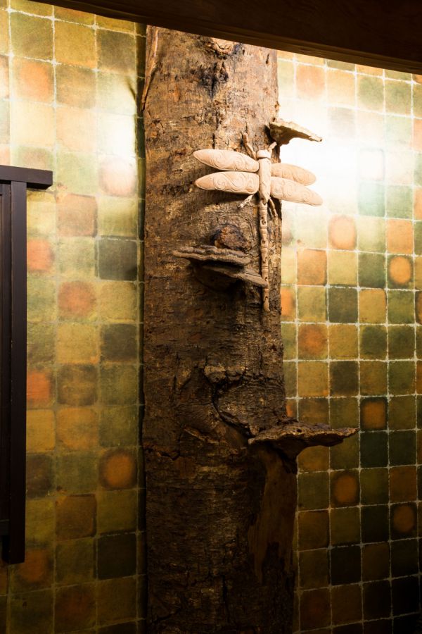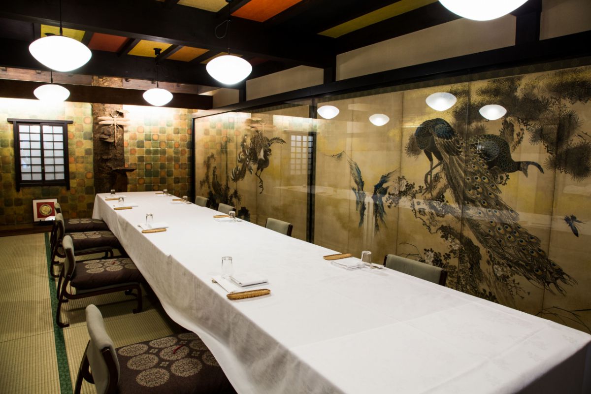 中に入ると内装にもこだわりが。9部屋の個室がありますが、それぞれテーマが異なるユニークな造りをしています。石蔵をそのままいかした大広間は、孔雀の屏風絵が飾られ高級感たっぷり。20人以上が入れる広さです。
