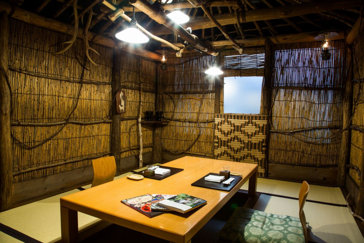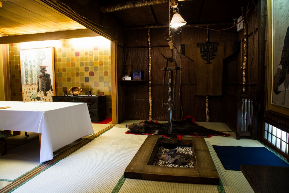 アイヌ民族の伝統的な家屋をイメージしたチセの間。ここはアイヌ民族出身で、アイヌ文化の研究者として活躍した萱野茂さんが監修しており、実際の造りがそのまま再現されています。