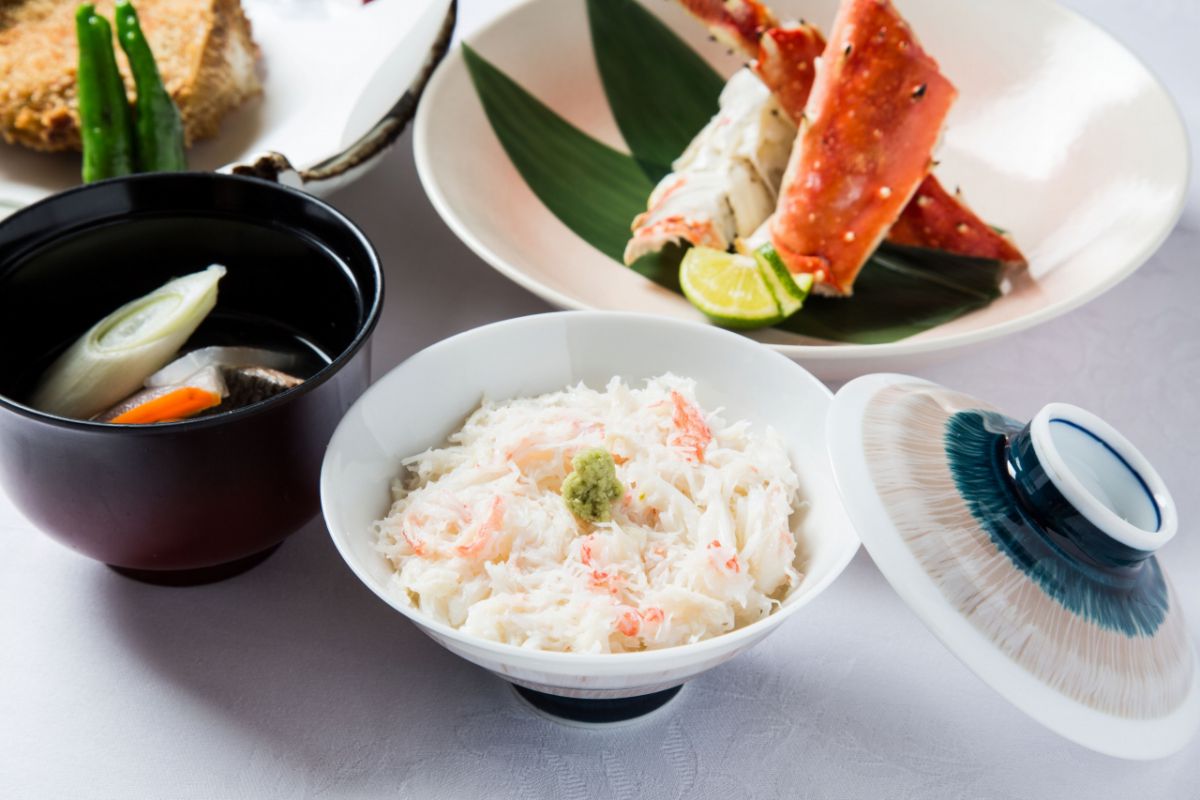 カニの身をほぐしたカニご飯と、北海道の郷土料理・サケの三平汁は”これぞ北海道”の組み合わせ!そのほか、近海の魚介を使う刺身の盛り合わせやトウモロコシのすり流し椀など、すべての皿で北海道の味覚を満喫できます。