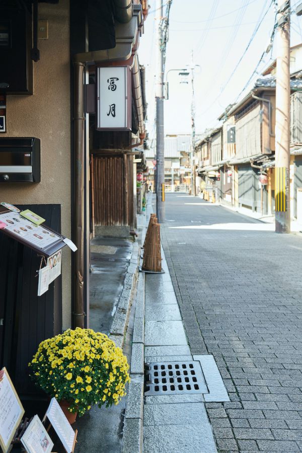 石畳の続く祇園町南側。格式高いこの街並みで100年の歳月を経て立ち続ける「冨月」。