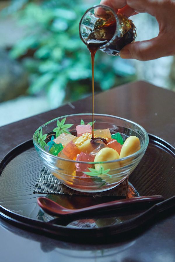 秋らしいメニューをもう1品。季節のあんみつ、この日は「紅葉あんみつ 焼き芋あんとつぶあん」です。赤色とオレンジ色の寒天を色づく紅葉に見立て、かぼちゃを練り込んだお豆腐白玉を添えました。
