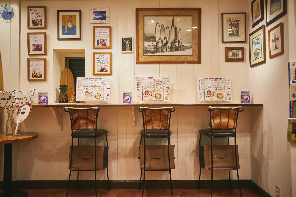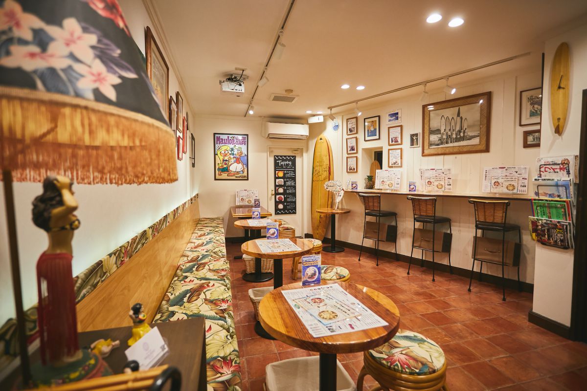 木の温もりとハワイアンファブリックが印象的な落ち着いた雰囲気の店内。