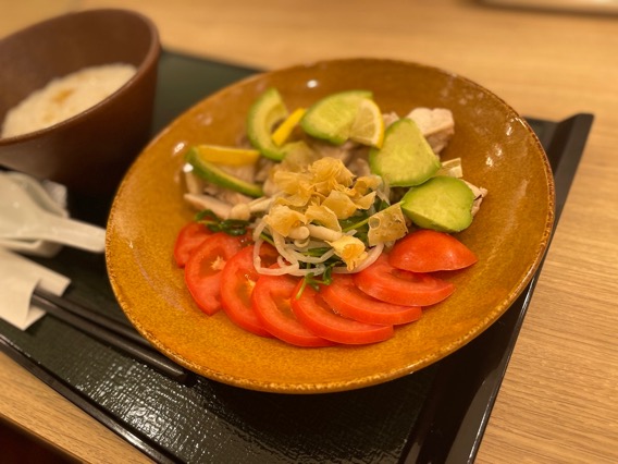 朝以外でももちろんお粥のメニューを楽しめます!なかでも美容や糖質が気になる方には「ロカボ中華粥」がおすすめ♪ 糖質を抑えているうえに、美容にうれしいトマトやアボカド、ヘルシーな蒸し鶏がたっぷり!