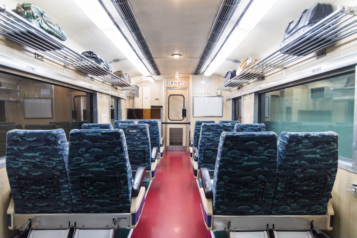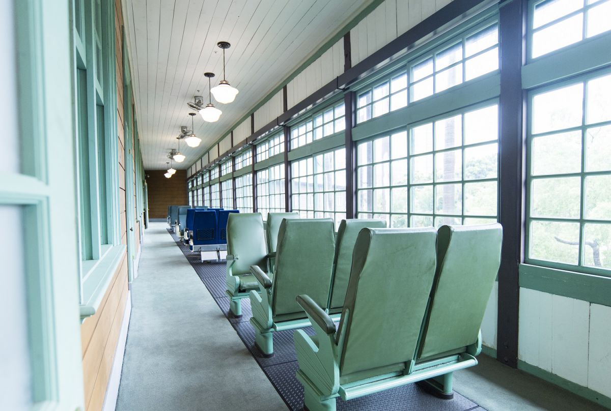 ジオラマルームの縁側部分には、以前使用されていた電車の椅子の展示もあり、実際に座ることもできますよ!