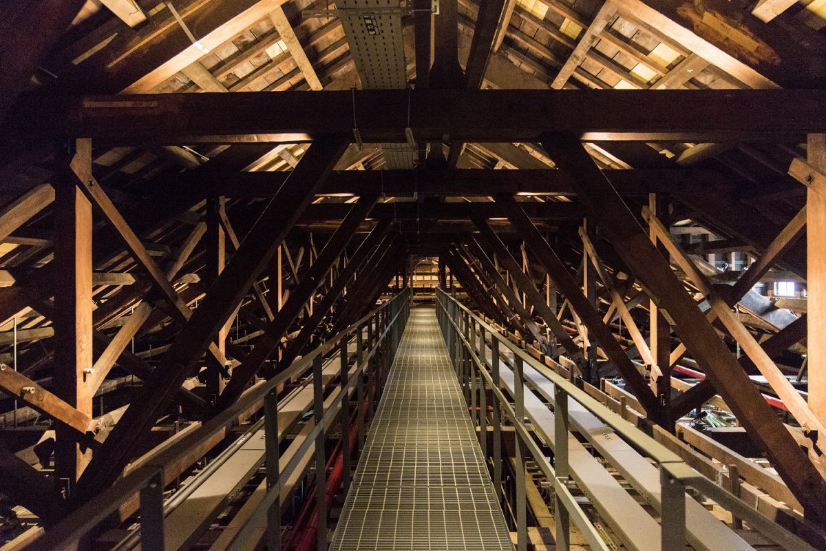 今回、普段は開放していない屋根裏も、特別に撮影させてもらいました。木の梁は建てられた当時の物が残っているそうです。屋根裏は空調がなく暑いため、冬の期間のみ予約制のガイドツアーなどで見学することができます。