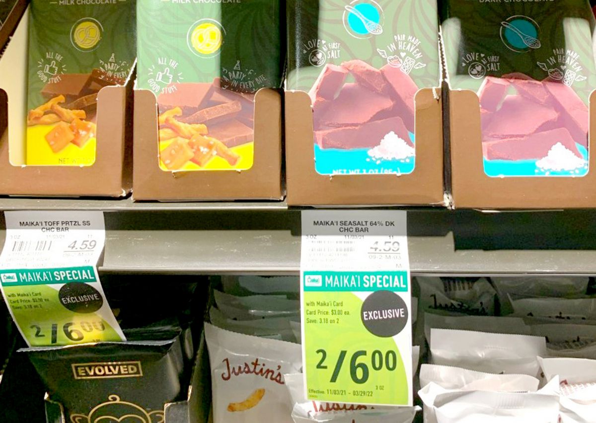 ここで、ちょっとお得なお買い物のコツをご紹介。フードランドには「マイカイカード」という登録料年会費無料のメンバーシップがあり、値札に割引マークがついているものはメンバーシップの割引価格で購入することができます。この日もこちらのチョコレートは$4.59の定価から、割引されてなんと2個で$6(1個$3)と、$1.59もお得でした!そして、メンバーになれば、旅行者でもこの割引を利用することができるんです。レジにて「マイカイカード」を作りたい旨を伝えて、電話番号とメールアドレスを登録すると割引がすぐに適用されるので、ぜひお得にショッピングしてみてください。(※マイカイスペシャル価格対象商品やセール商品は、週替りで変動するため、価格は都度変更されます。)