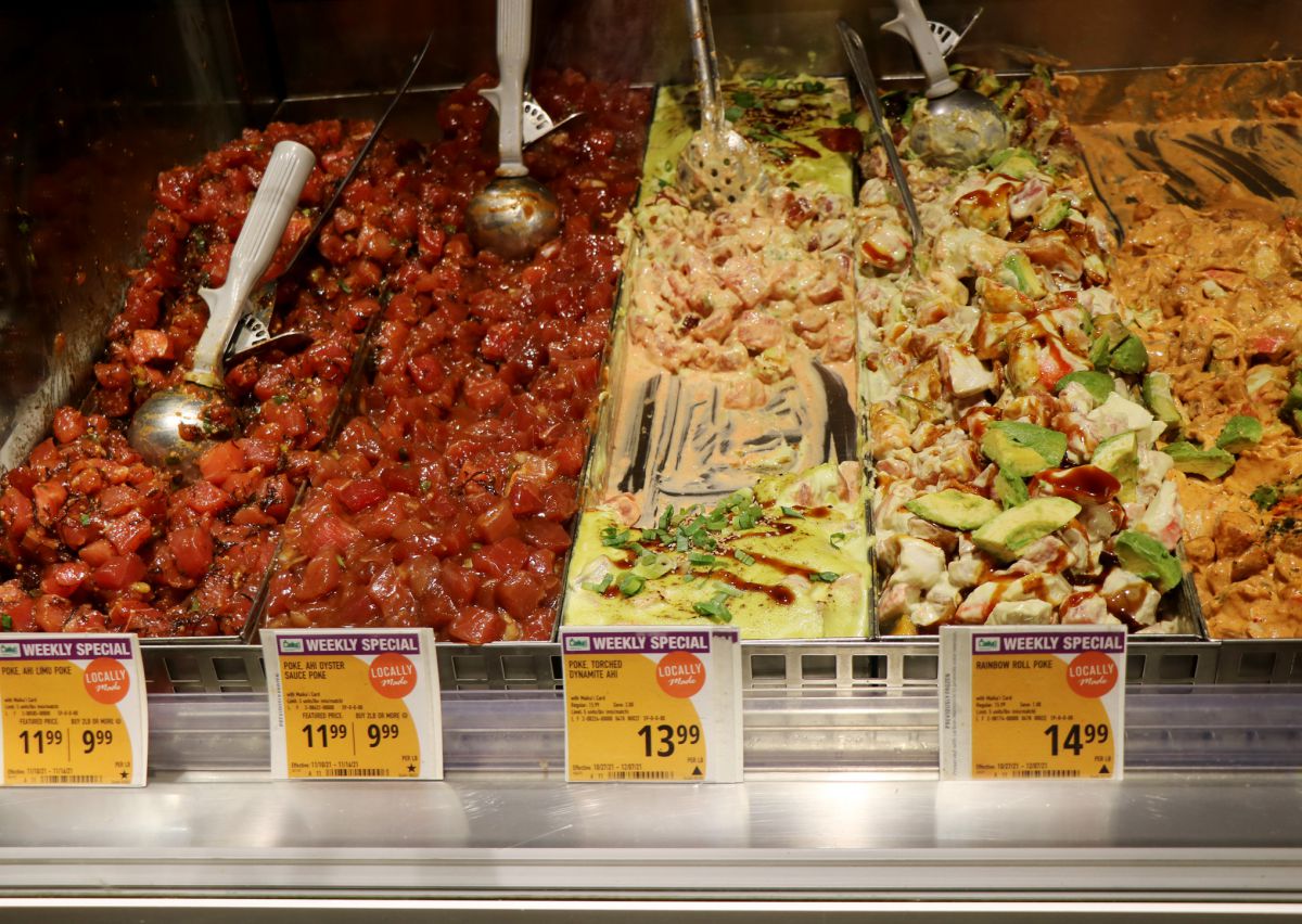 ハワイ近海で獲れた新鮮なマグロや魚介を使ったポケは、計り売りにて1ポンド(約450g)または半ポンド(約225g)で購入可能です。種類ごとに値段が違うので値札をよくご確認くださいね。ご飯のうえにポケが乗ったポケ丼は、ポケの種類を1種類か2種類選び、白米か玄米かもチョイスできます。