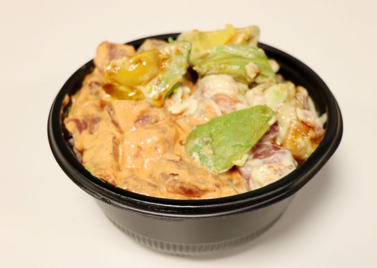 こちらは「2チョイスのポケ丼」$20.29。左側が1番人気のスパイシーフレッシュアヒ、右側がアボカドが入ったレインボーロールポケです。フレッシュポケは値段が1ポンド$10以上になりますが、冷凍のものとはやはり味に差が出るので、フレッシュなものをいただくのがおすすめです。