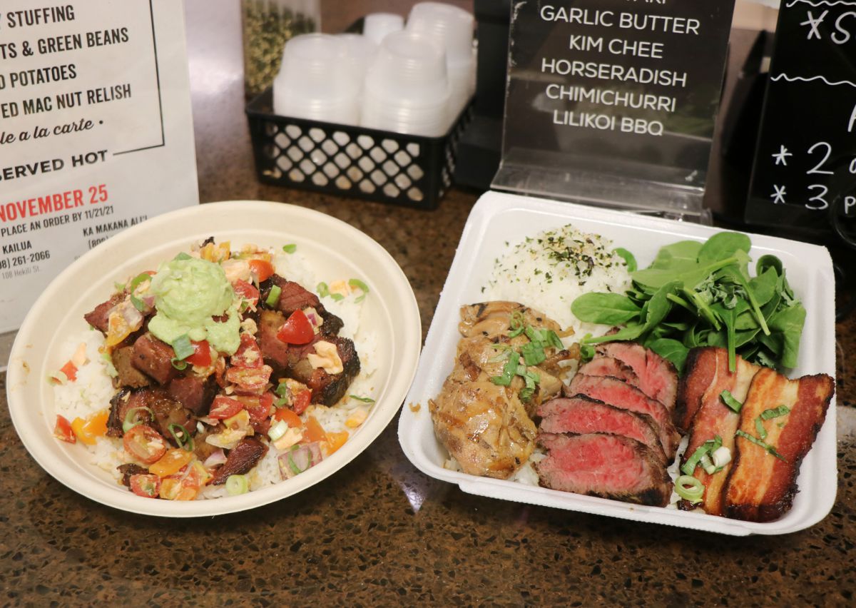 「ビルド・ユア・オウン・ボウル(左)」$13はご飯やサラダ、上に乗せるミートやソースを自由に組み合わせることができます。「プレート(右)」$12.99~のサイドは、ご飯または玄米、グリーンサラダまたはポテトサラダから選択可能です。