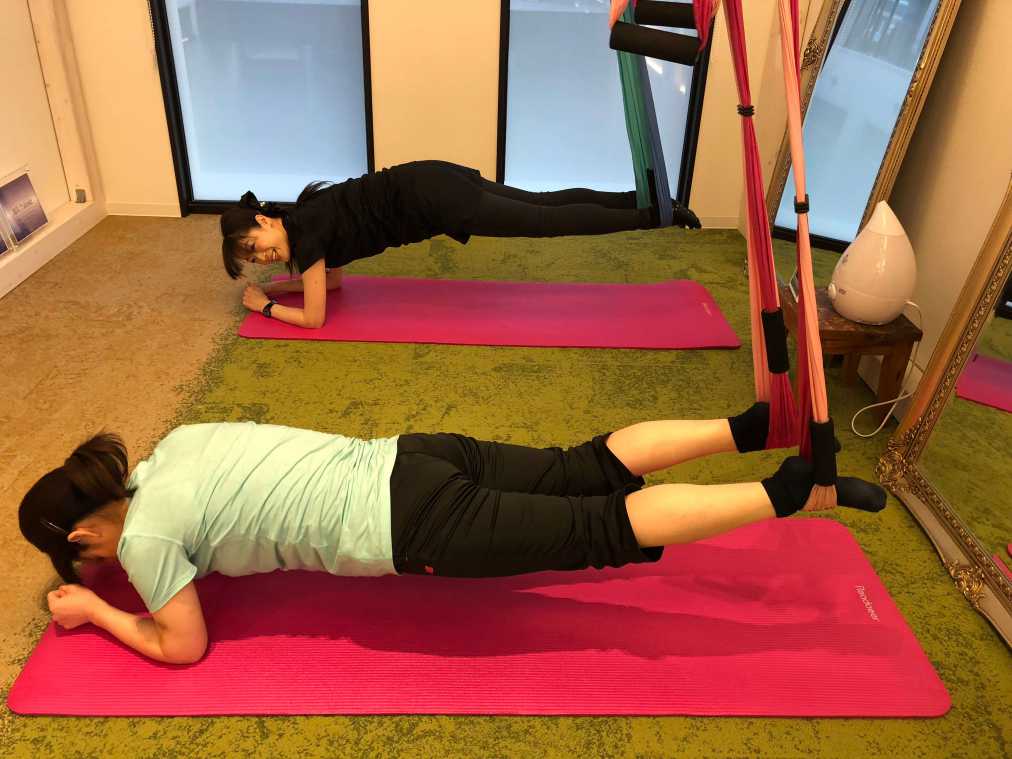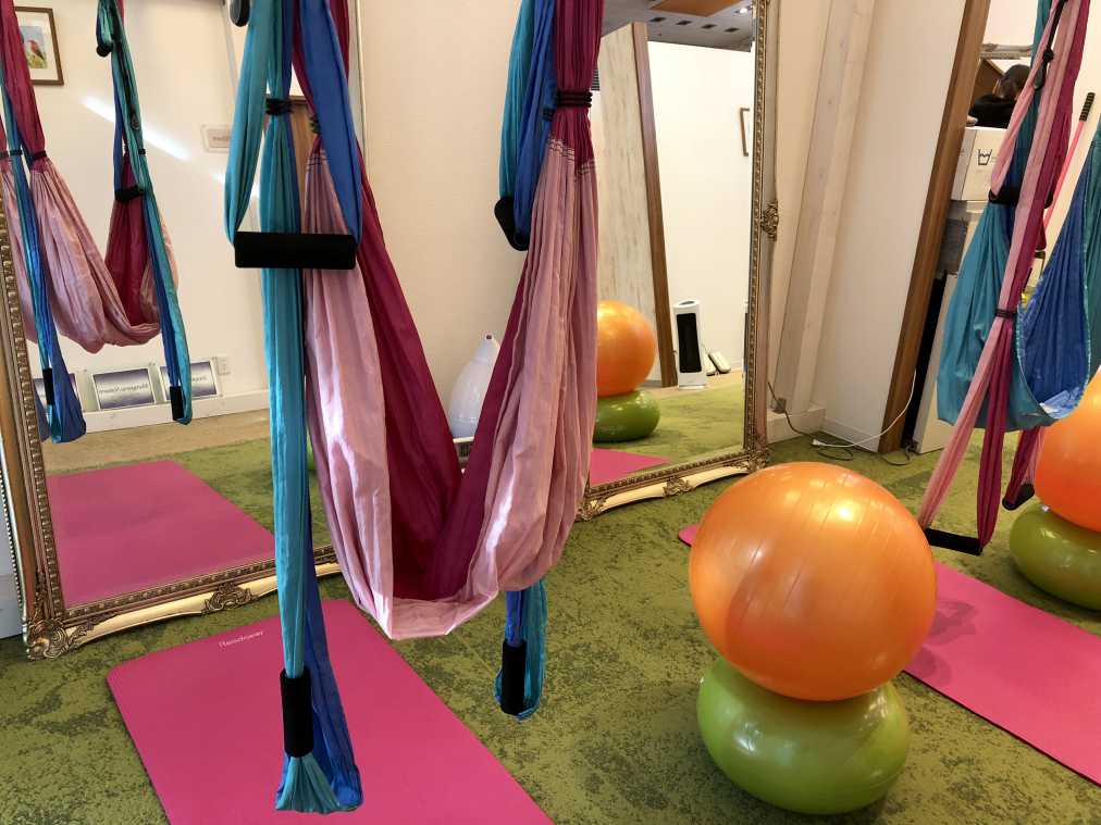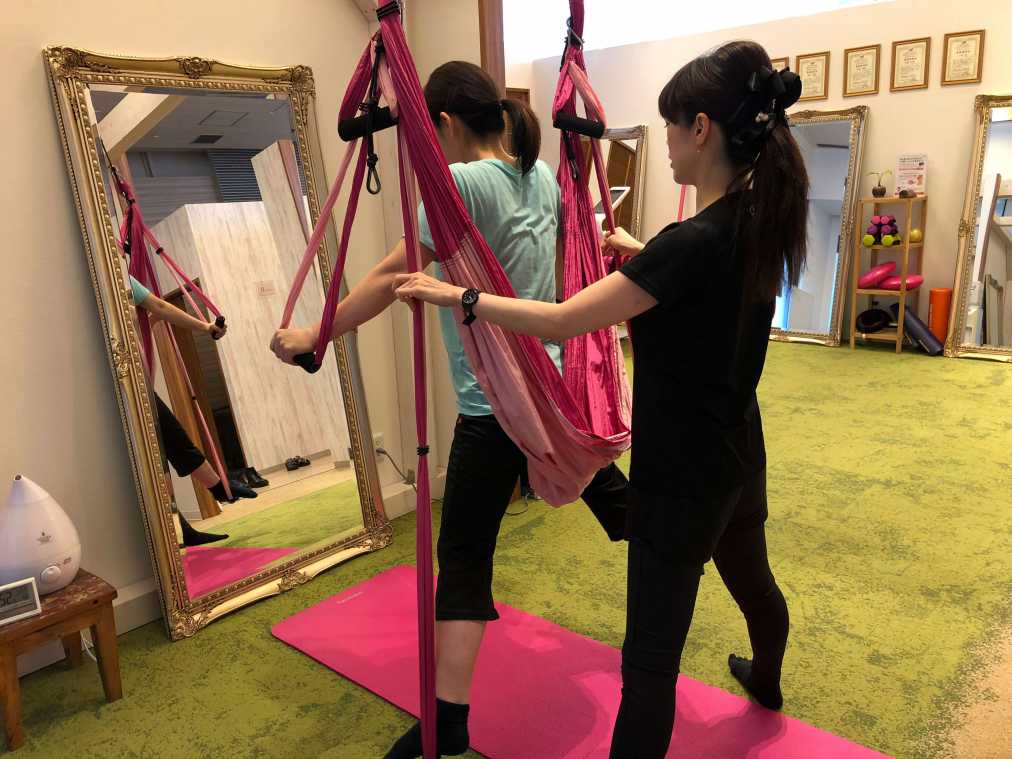 エクササイズは、まずはマットに座り行う簡単なストレッチを行ってから、ハンモックを使い空中に浮びながらの運動に移っていきます。徐々に体がほぐれていくのが分かります。