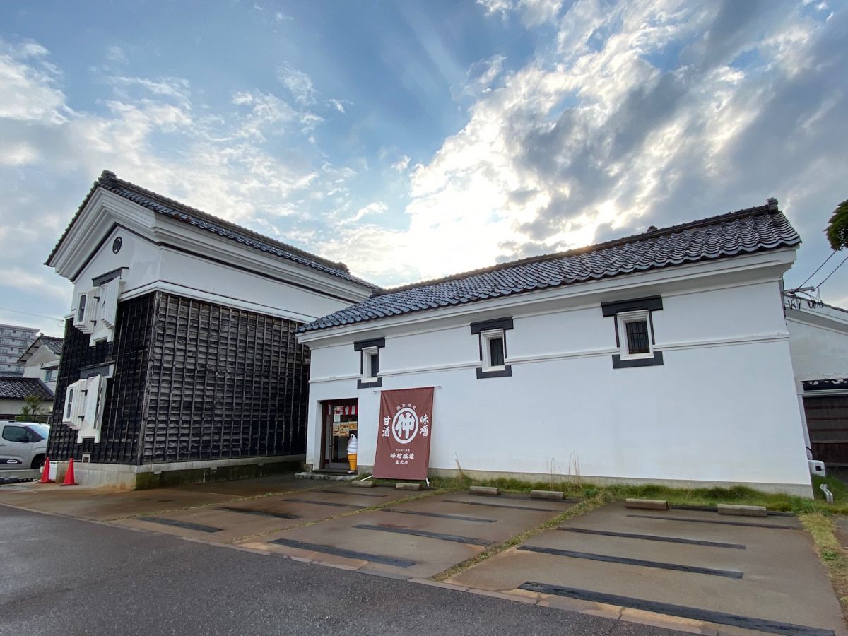 『今代司酒造』から徒歩5分ほどにある『峰村醸造』。1905年創業の味噌と味噌漬け醸造元です。江戸後期~明治時代に建てられた真っ白な漆喰の壁が印象的な味噌蔵が目印です。