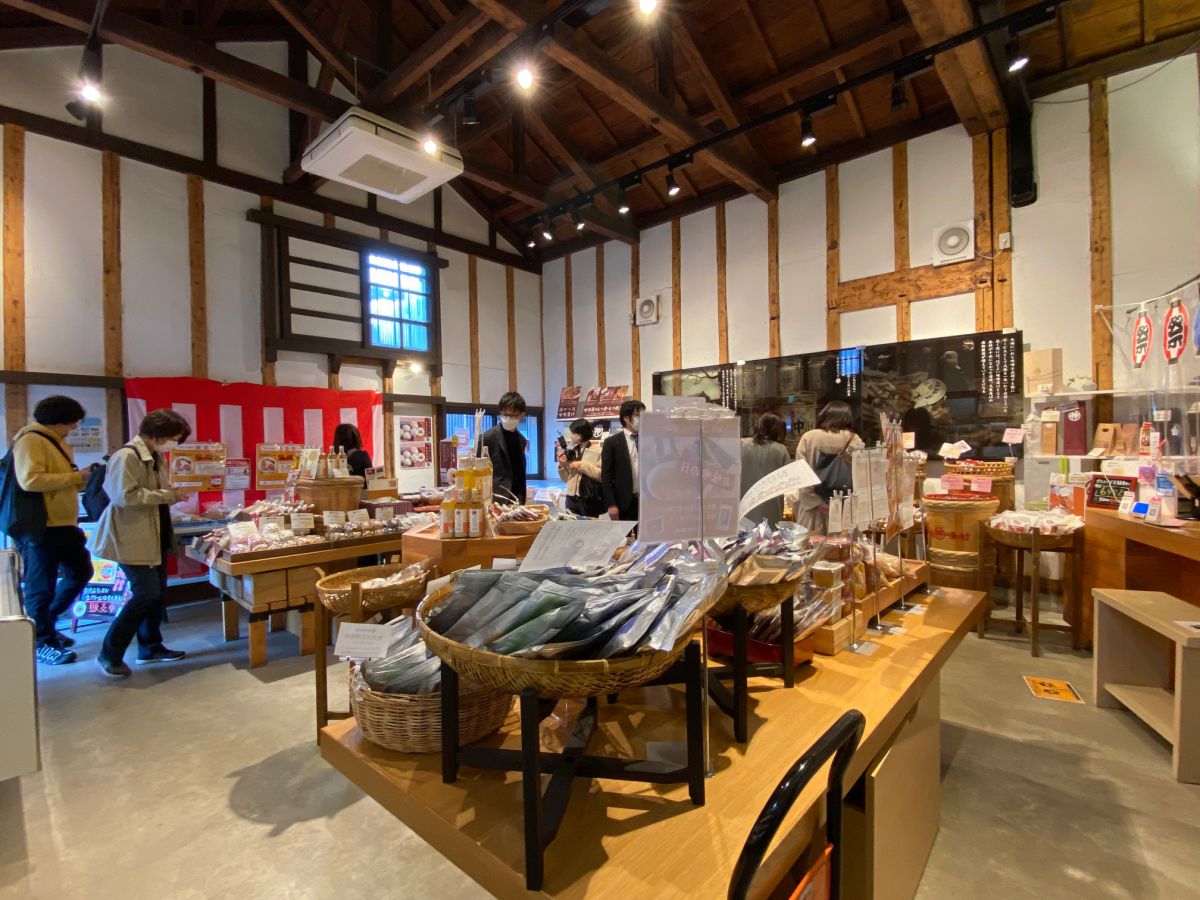 味噌蔵に隣接し、こちらも土蔵をリノベーションした直売ショップでは、味噌や味噌漬けの他、味噌づくりで培った発酵・醸造技術を応用した調味料や惣菜、お菓子などを販売しています。味噌のもつ煮や豚ロース、ハンバーグに餃子など、味噌を使った食材がずらり。バウムクーヘンや大福など、おみやげにぴったりな味噌スイーツもあって、ついつい買いすぎてしまいそうです。
